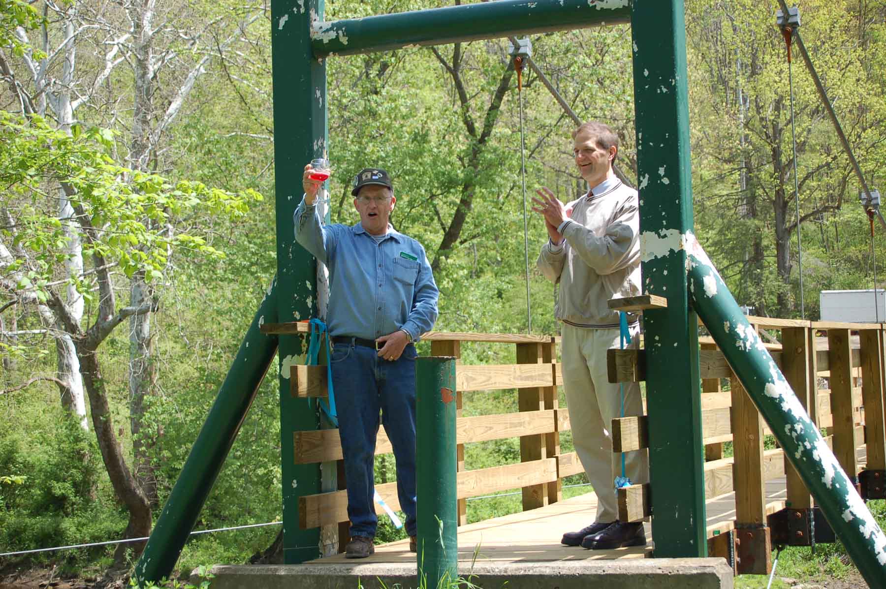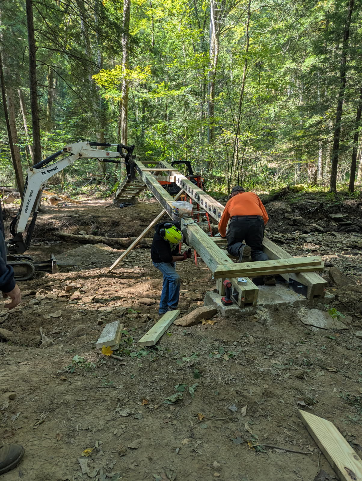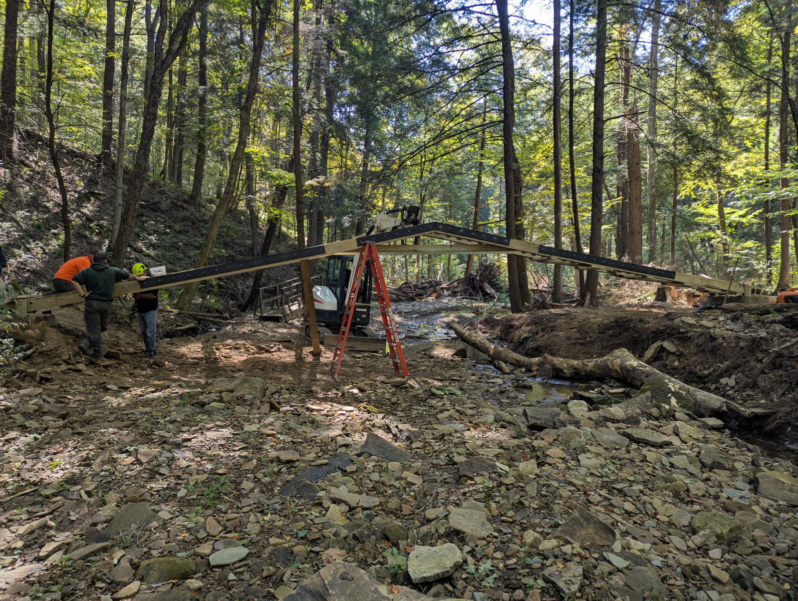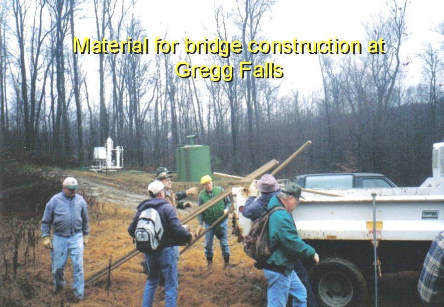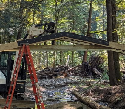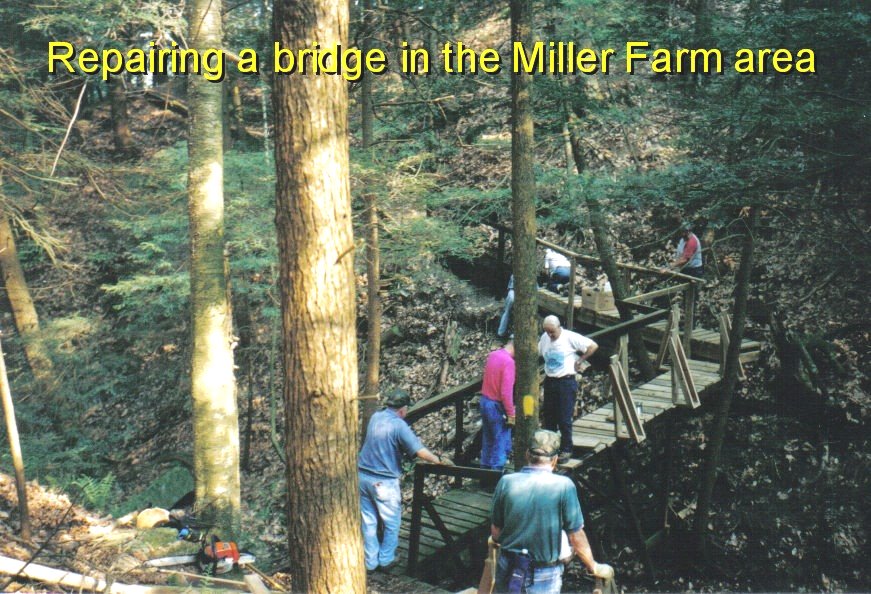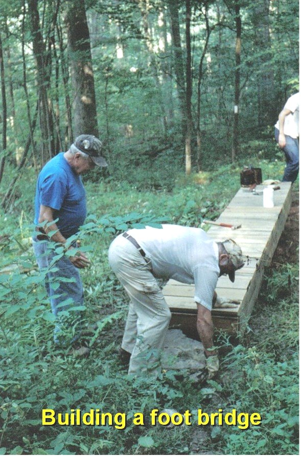 In addition to removing downed trees the group keeps the yellow and white blaze trail markings visible for hikers. They maintain and replace foot bridges that traverse wet areas and small ravines. During the summer of 2025 they replaced the Bent Nail Bridge over Wolfkiel Run which was destroyed by a spring flood.