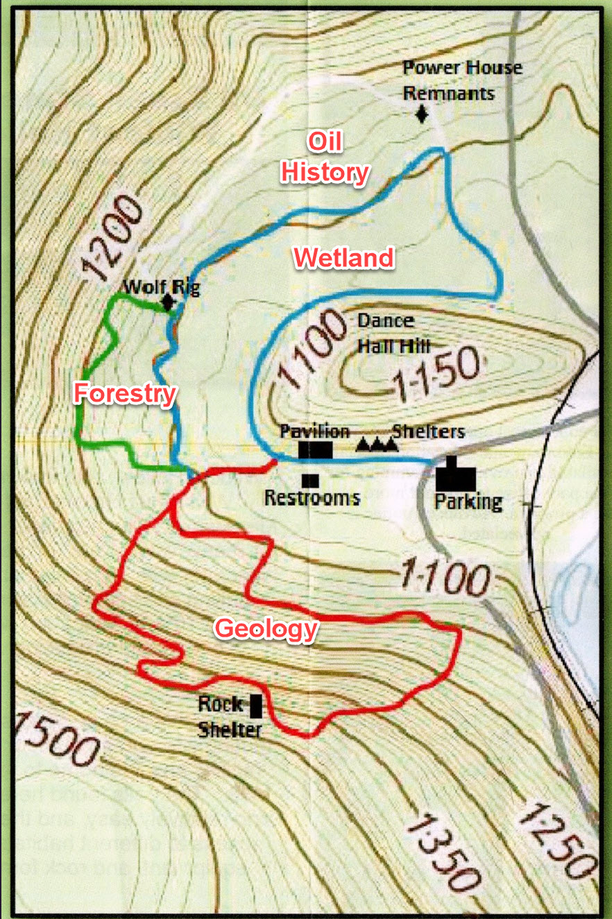 This trail makes a loop around a cattail wetland formed by the collection of water off of Wildcat Run. This trail leads to the Oil History and Forestry Trails.