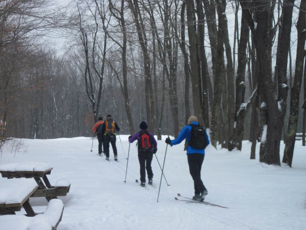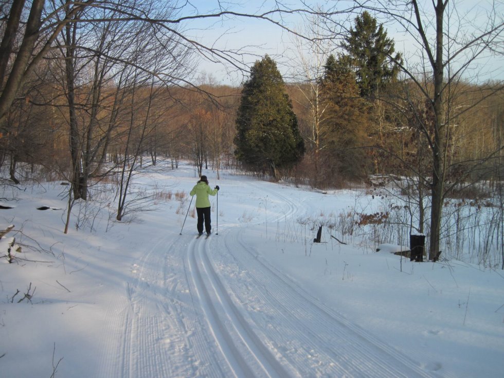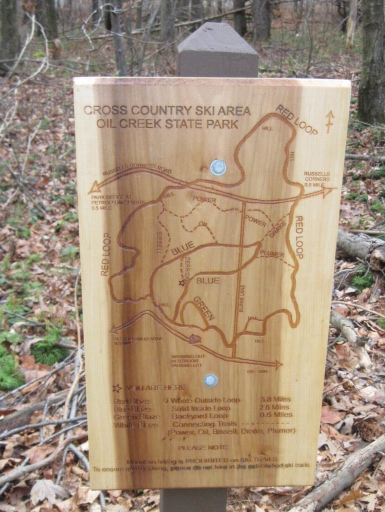 The Park's cross-country ski area features three main trails, Red, Blue, Green (based on blaze color) with six White connecting trails. Most of the trails utilize old oil lease and lumber roads and are generally about 10 feet wide.